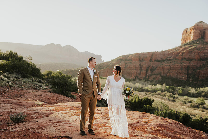 Adorable, adventurous, and full of silly giggles, Brianna and Mike are outdoor enthusiasts from the Pacific Northwest who fit together perfectly. After meeting on a dating app, their connection grew over shared adventures and inside jokes. When it came time to plan their wedding, they knew they wanted something private, meaningful, and rooted in the outdoors they love most. Sedona’s red rock desert became the dream backdrop for a day that felt equal parts magical and laid-back.
